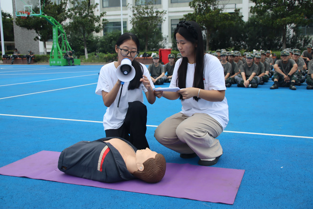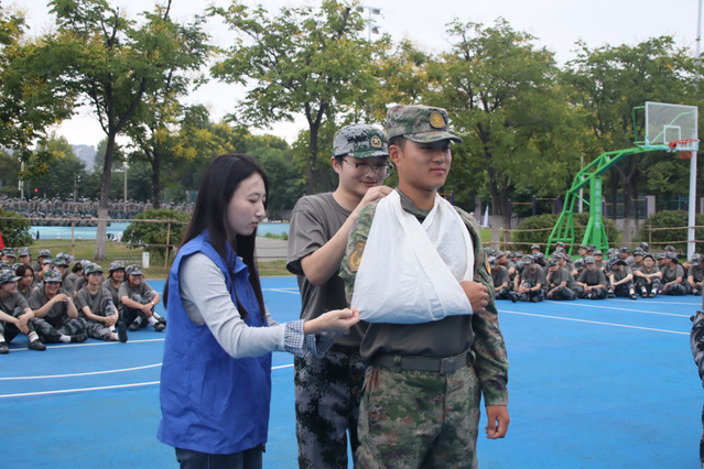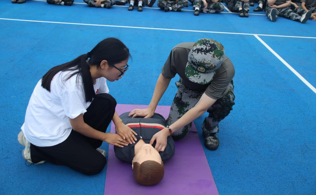 在训练间隙,志愿者们在军训场地围绕新生军训期间高频突发状况,开展针对性宣讲。志愿者结合真实案例,详细讲解中暑的预防与现场处置;针对训练中可能出现的突发意外,现场演示心肺复苏和外伤止血包扎术的操作要点,帮助新生快速掌握科学处理流程。