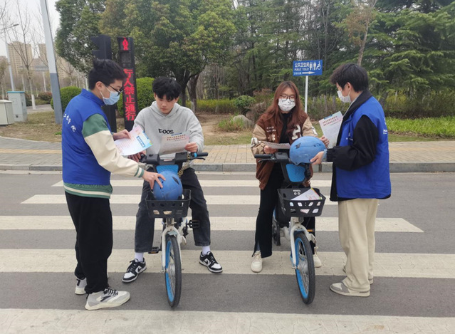 开展“树立文明意识,心存交通法规”文明交通宣传活动。3月17日,志愿者们前往校园、市区等主要交通路口开展文明交通宣传活动。志愿者们将安全交通宣传册发放给过往行人,同时,提醒骑行电动车的群众安全行驶、规范停车。志愿者们还帮忙将车子停到规定区域,摆放整齐。本次活动让同学们进一步树立了文明出行理念,也为形成相互礼让的良好社会风尚贡献了自己的力量。