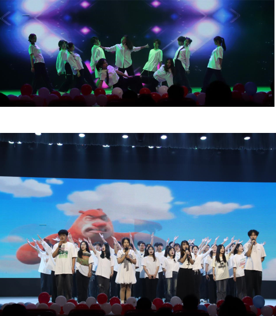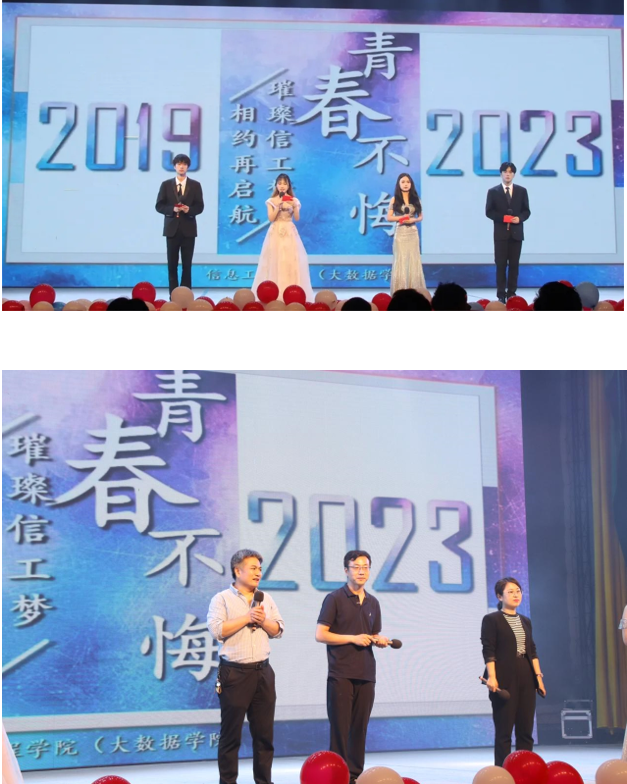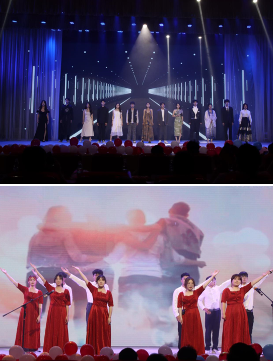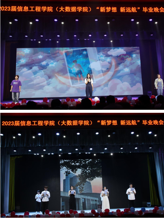 晚会伊始,教研室主任们对毕业生送出寄语,祝福毕业生在未来的人生道路上一帆风顺、前程似锦。随后,晚会在舞蹈串烧中拉开了序幕,歌曲《大梦想家》唱出了毕业是梦想开始的起点;小品《减肥帮往事》诙谐幽默,让毕业季不再那么伤感;舞蹈《Girls and Boys》和走秀表演燃爆全场;合唱《凤凰花开的路口》、《我乘着风飞过来》祝福毕业生们也可以乘着风飞向未来;在惊喜环节,辅导员张娇老师和季娴老师带来的歌曲《小幸运》,唱出了对毕业学子们殷殷期盼和深情祝福;毕业生代表们深情演绎的歌曲,把美好的回忆带上新的征程。诗朗诵《毕业,再见》带全场同学回忆起这些年的青春故事。