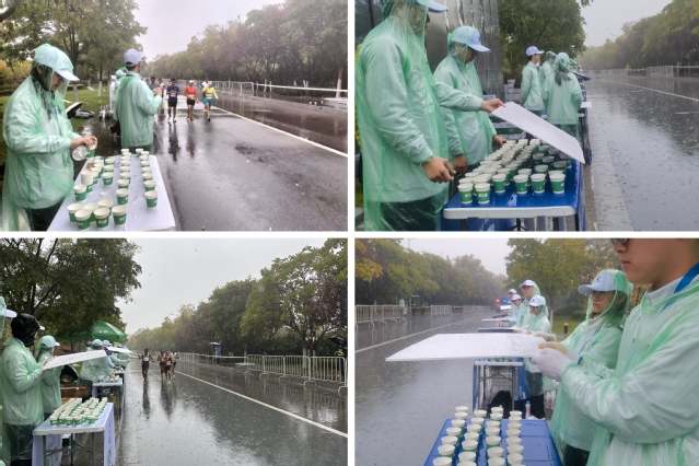 凌晨5:30,公司志愿者们已经在赛道35公里补给站准备就位。虽然天公不作美,寒风凛冽,大雨倾盆,也不能阻挡志愿者们服务的热情。他们仔细检查,认真准备,按照标准把物品摆放整齐,驻足等待参赛选手的到来。赛道上,部分参赛选手出现体力不支等疲乏症状,志愿者们不受风雨影响,手捧饮水为运动员们提供能量补给,并一直为参赛选手呐喊助威、鼓劲加油。