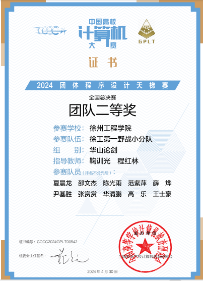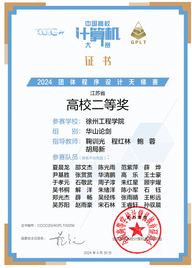 近日,第九届中国高校计算机大赛——团体程序设计天梯赛总决赛落下帷幕,本次比赛有来自北京大学、南京大学、浙江大学等全国580所高校的1800多支队伍18000多位员工参赛。公司选派50名员工组成5支代表队参加本次比赛。经过激烈角逐,在普通本科 “华山论剑”组中,邵文杰、夏晨龙等30名员工组成的3个团队分获总决赛全国团队二等奖1项、三等奖2项,另获江苏省高校团体二等奖1项(高校团体奖排名江苏普通本科4/36,位列全国普通本科66/461名)、个人国奖9项。