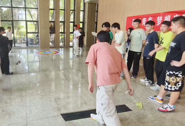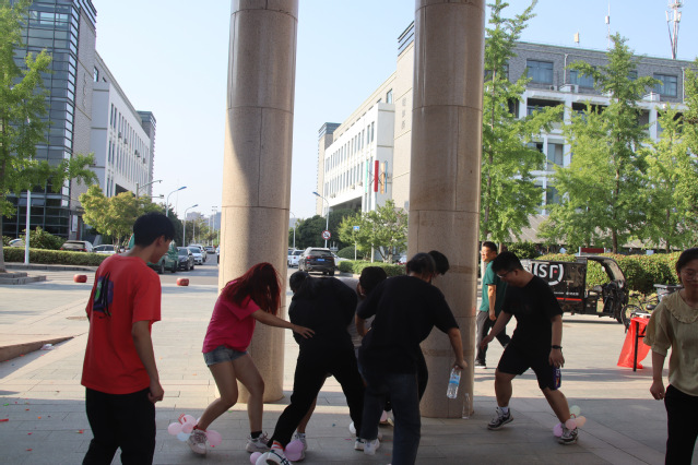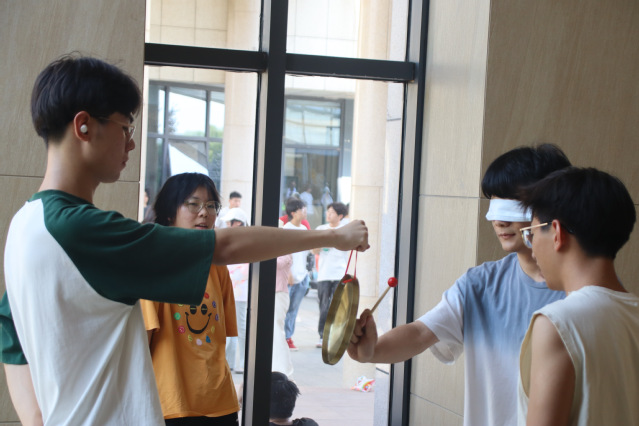 在蒙眼敲锣比赛中,参赛者戴上眼罩,在原地转五圈后,凭借感觉走向前敲响锣。在比赛过程中,搭档们紧密配合,频发的“小状况”给现场增添了不少乐趣。同学们相互打趣着彼此的失误,在欢声笑语中完成了比赛。