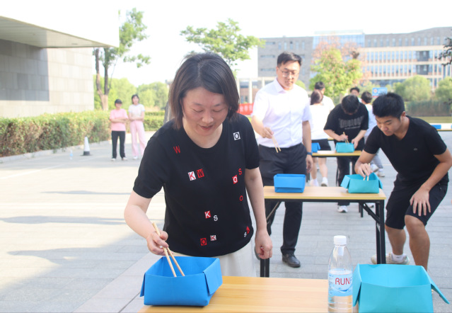 在夹乒乓球接力比赛中,师生共同组队,小心而稳定地用筷子夹住小小的乒乓球。比赛现场妙趣横生,激情与紧张同在,大家聚精会神、全力以赴,充分发挥团结协作的精神,共同完成了比赛。