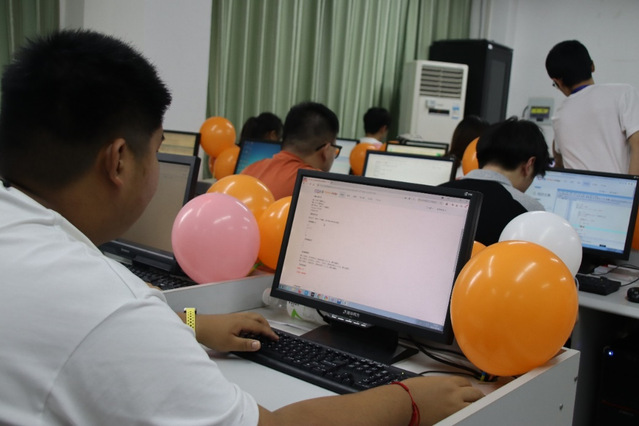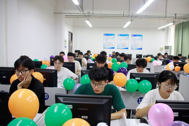 本场比赛采用模拟ACM-ICPC赛制,参赛选手可以使用C++、java、python中的任何一种语言进行问题解决,过题多者获胜,过题数相同时用时短者获胜。比赛共设置了12道赛题,参赛者同时在线作答,由“希翼”系统现场自动评判,实时更新榜单。参赛选手每正确作答一道题,工作人员就会在他的桌前插上一只气球。比赛过程中,同学们分秒必争,冷静思考、沉着应战,随着比赛渐入佳境,一只只彩色气球升起在赛场上。整个比赛过程平稳有序,精彩纷呈,展现了同学们良好的精神风貌。