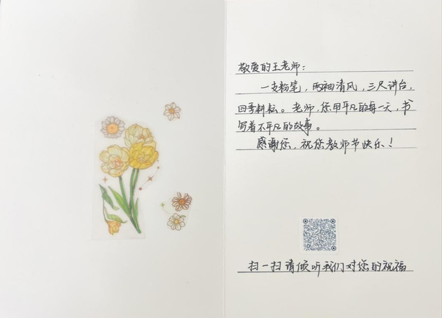 同学们满怀感激与敬意,将自己对老师的祝福收录在了小小的二维码里,并将二维码粘贴在精美的贺卡上,制作成每位老师专属的“声波贺卡”,教师节当天同学们亲手将贺卡送出。每一张贺卡都承载着独特的创意与真挚的情感,同学们同时在“声波贺卡”上以细腻的笔触写下对老师的祝福。