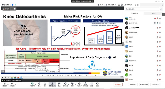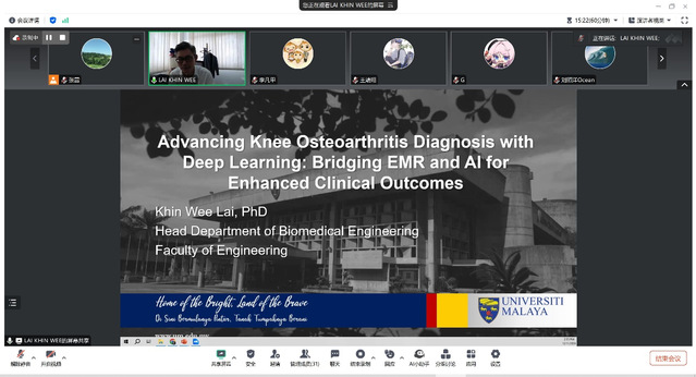 马来亚大学Khin Wee Lai教授作了题为“Advancing Knee Osteoarthritis Diagnosis with Deep Learning: Bridging EMR and AI for Enhanced Clinical Outcomes”的报告。Lai教授介绍了如何利用医学影像、电子病历和人工智能技术,为膝关节骨关节炎(OA)的早期诊断和病程评估提供解决方案。他分享了实验室近年来的重要成果,包括深度学习技术在OA检测中的应用及创新诊断工具的开发。此外,Lai教授还展示了马来亚大学在推动跨学科合作和应对全球医疗健康挑战方面的最新进展,引发了听众的浓厚兴趣。